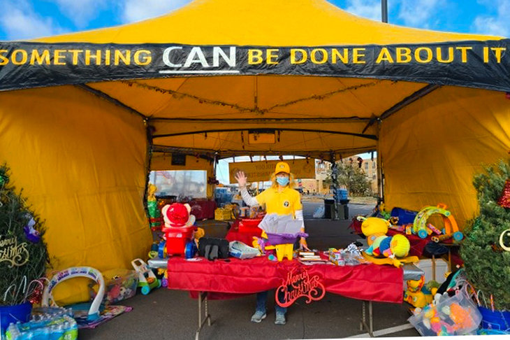 Бывший морской пехотинец пожертвовал сотни игрушек для детского стола в павильоне саентологических волонтёров, «чтобы у детей было Рождество».